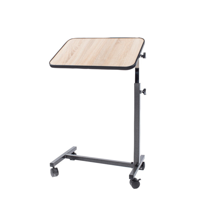 Slimnieka galdiņš ar četriem ritenīšiem. Galda virsma ar paaugstinātām maliņām pa visu galda virsmas perimetru un regulējamu noliekšanas leņķi. Galdiņa augstums regulējams. Ritenīši ar bremzēm.